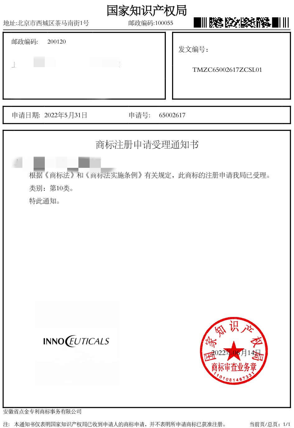 第10类“INNOCEUTICALS”商标受理通知书