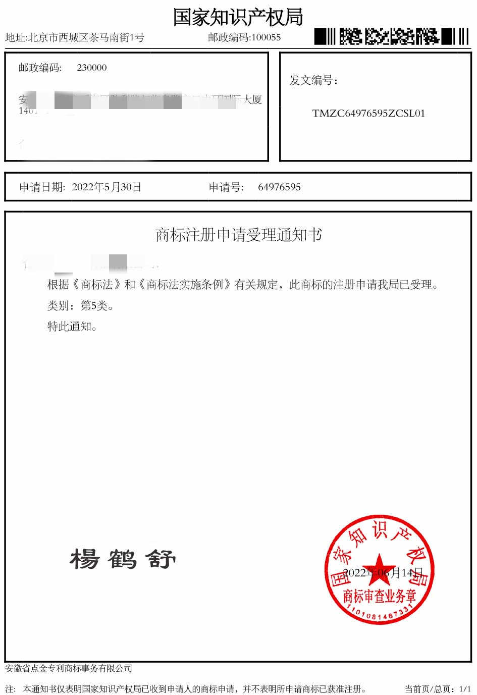 第5类“杨鹤舒”商标受理通知书