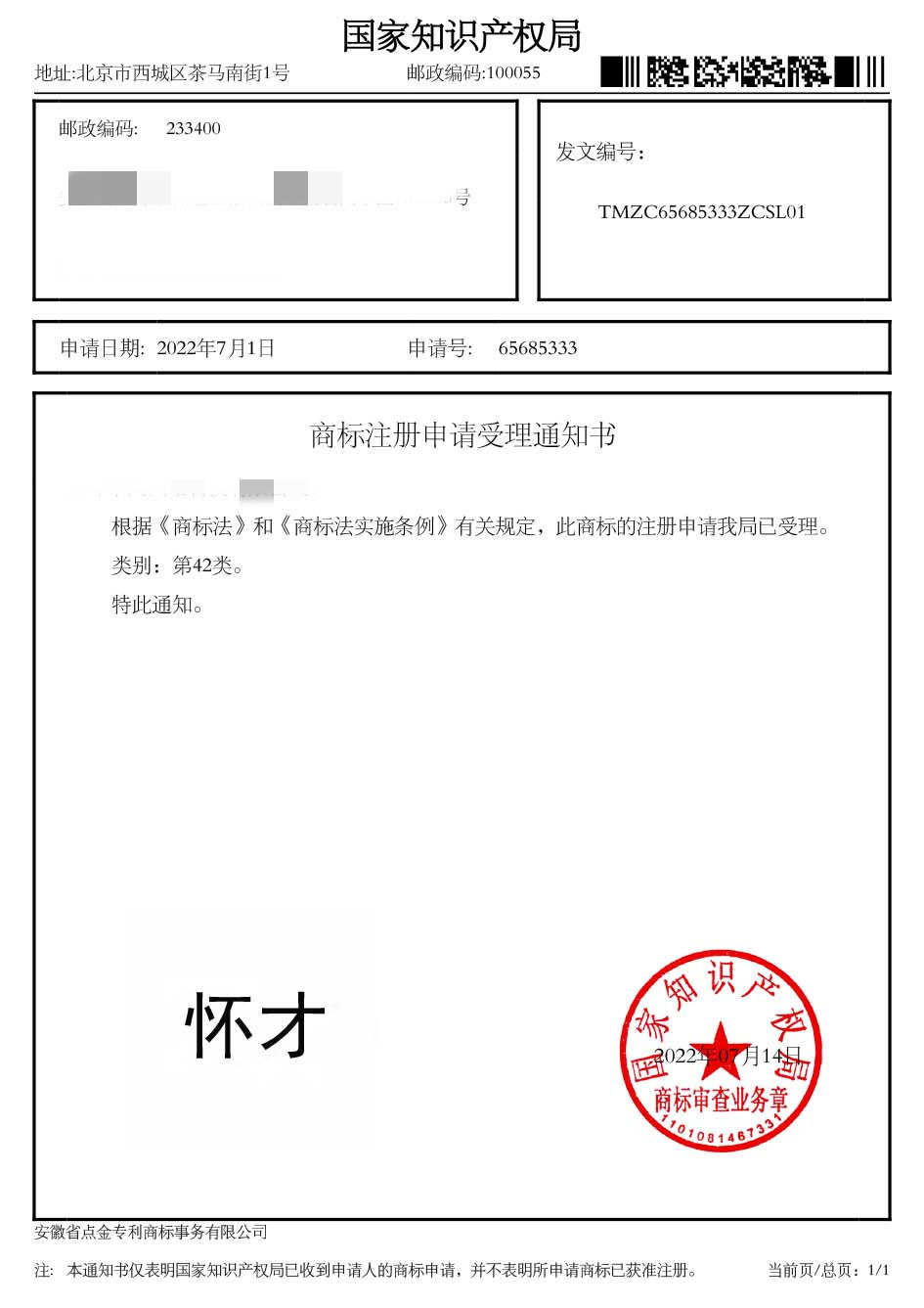 第42类“怀才”商标受理通知书