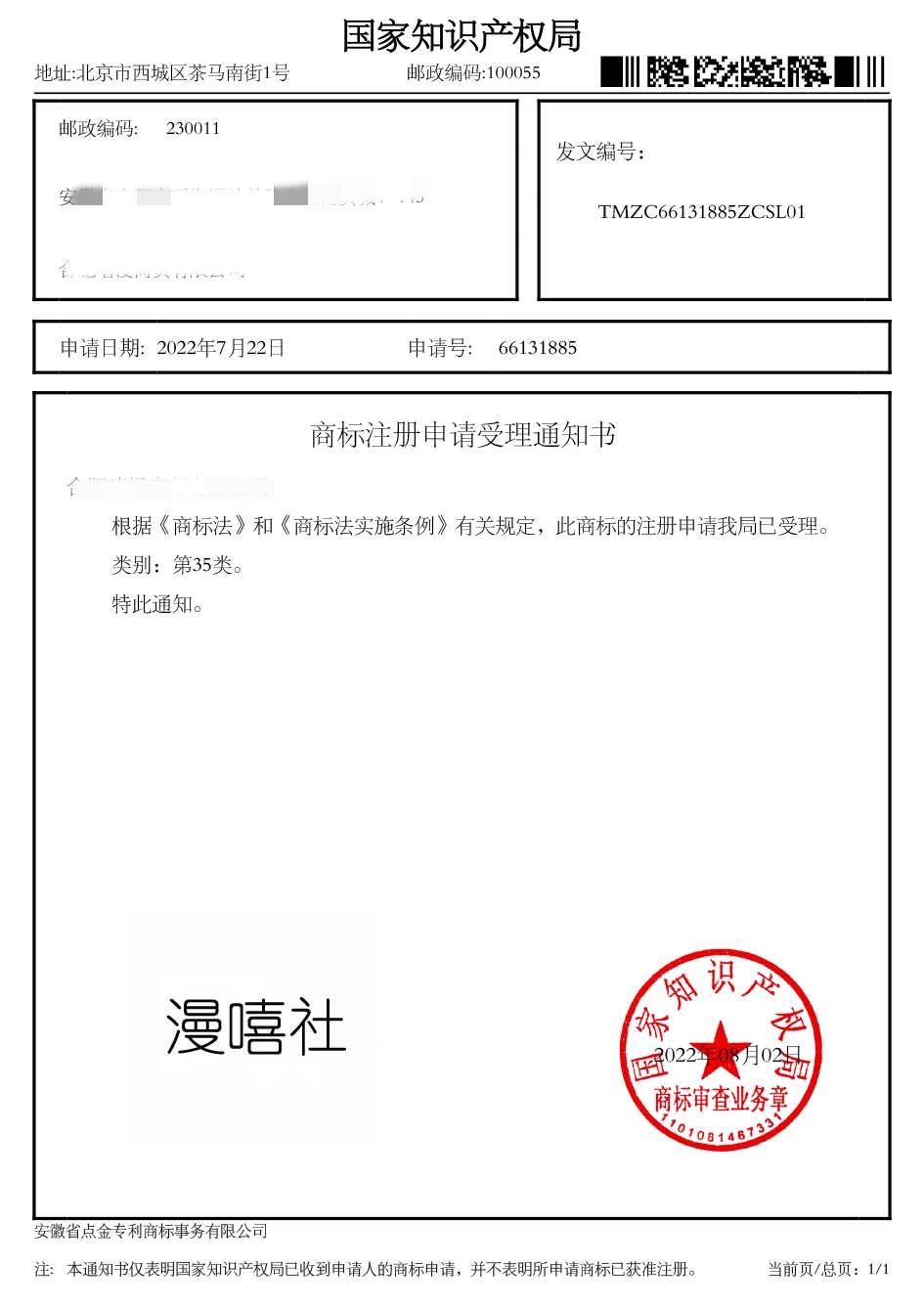 第35类“漫嘻社”商标受理通知书