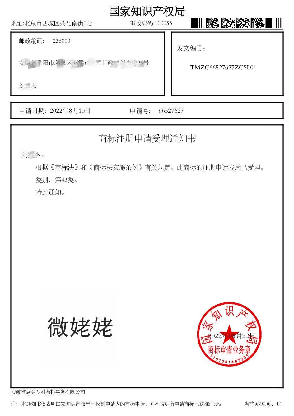 第43类“微姥姥”商标受理通知书