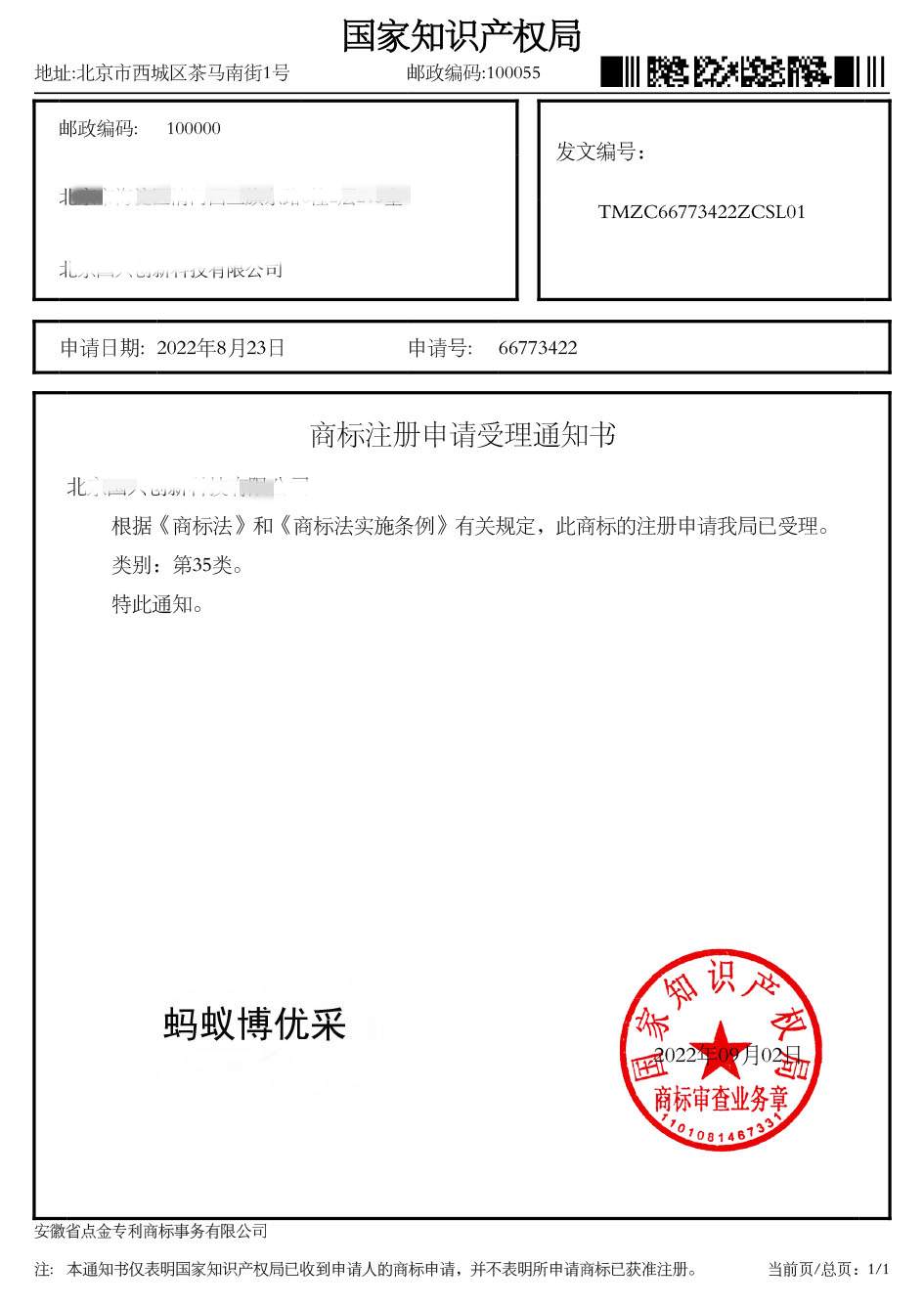 第35类“蚂蚁博采优”商标受理通知书