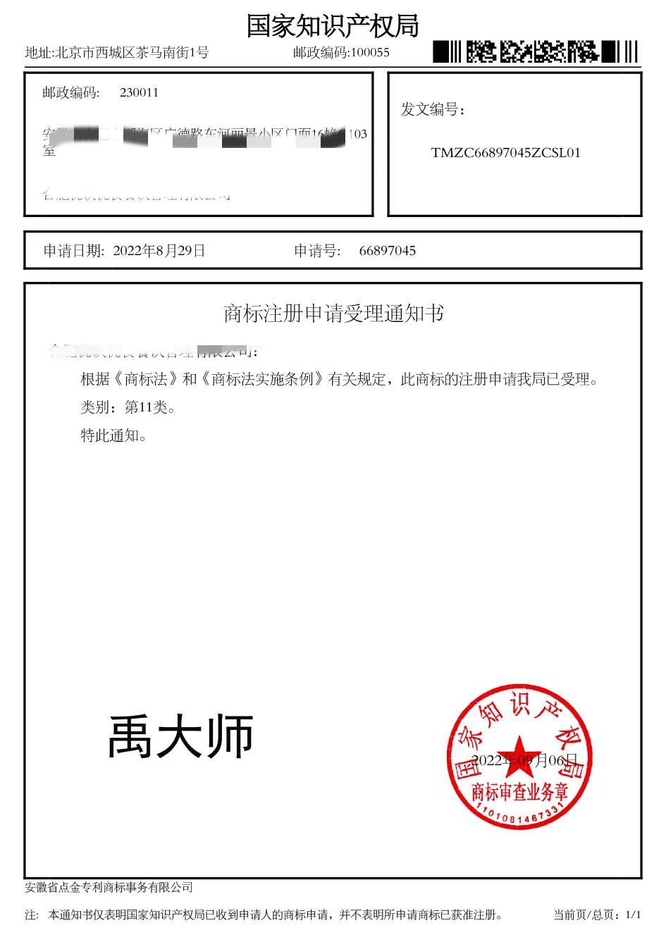 第11类“禹大师”商标受理通知书