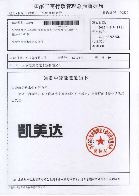 第19类“凯美达”受理通知书