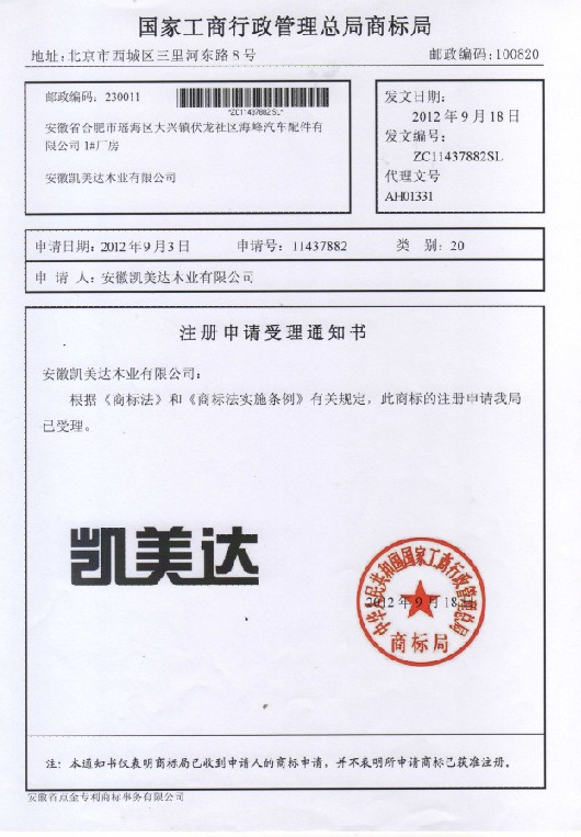 第20类“凯美达”受理通知书