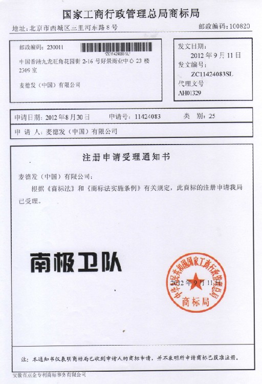 第25类“南极卫队”受理通知书