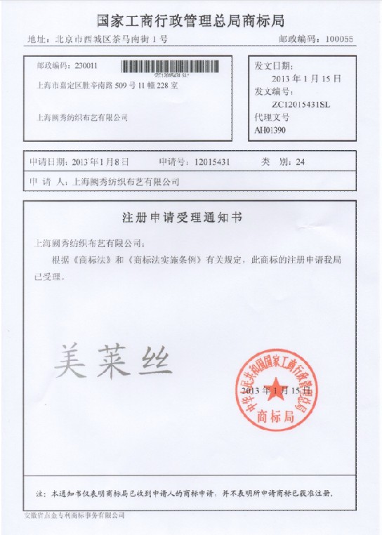 第24类“美莱丝”的受理通知书