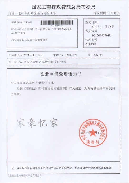 第24类“家豪亿家”的受理通知书