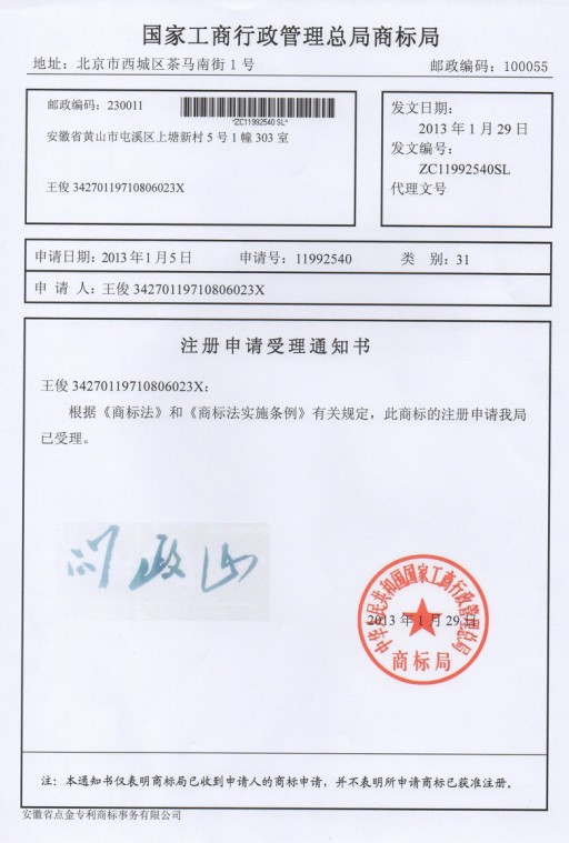 第31类“问政山”的受理通知书