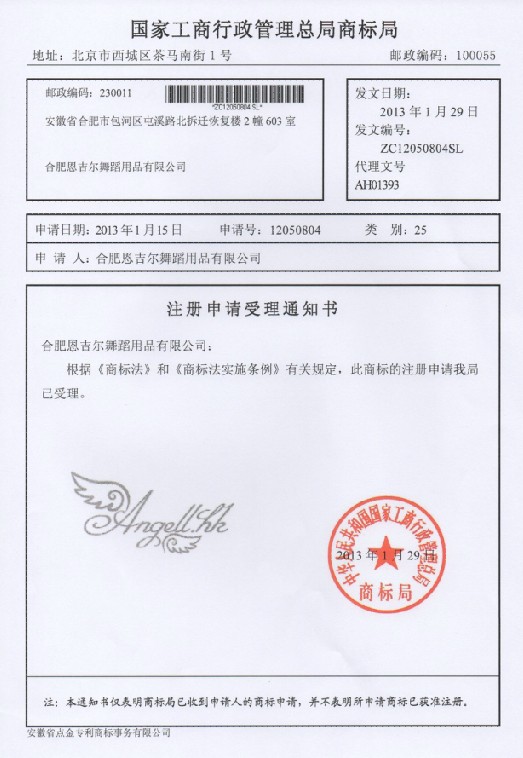 第25类“angellhk”受理通知书