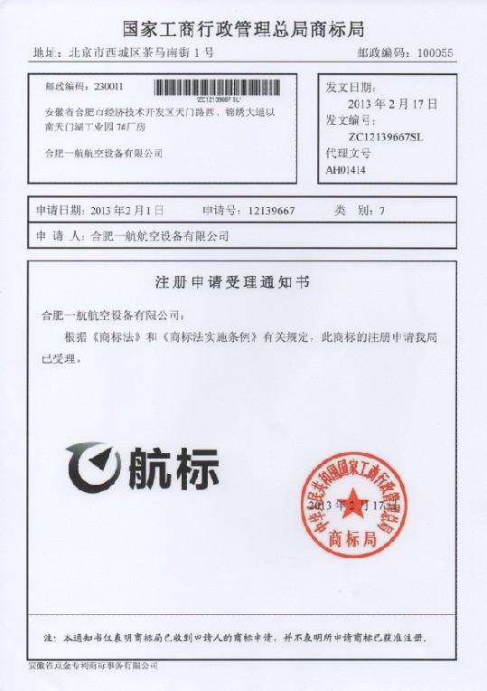 第7类“航标”及图形商标受理通知书