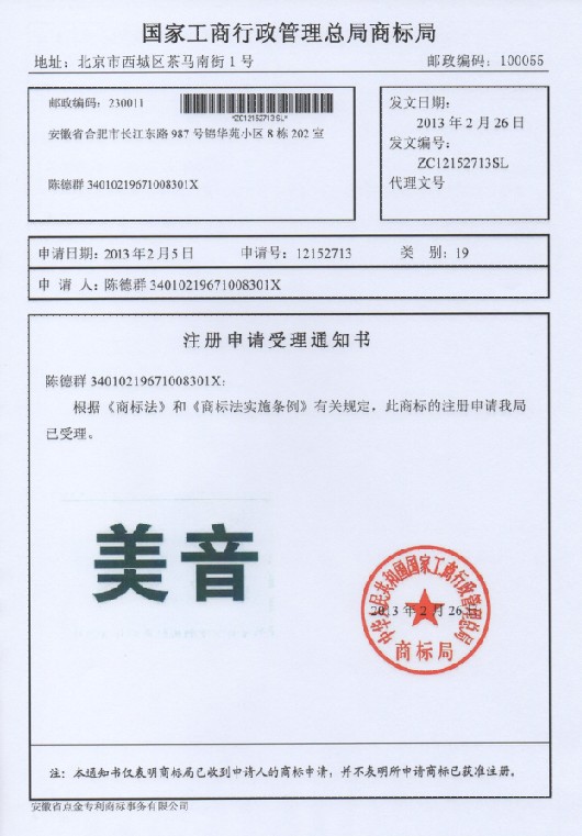 第19类“美音”商标受理通知书
