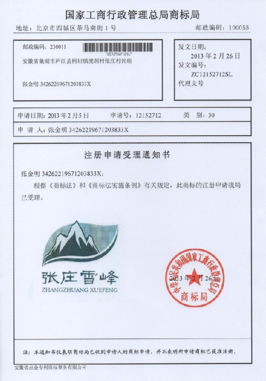 第30类“张庄雪峰”及图形商标受理通知书