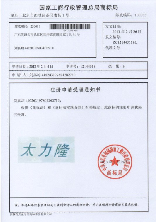 第6类“太力隆”商标受理通知书