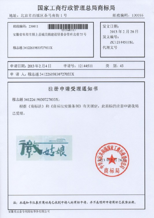 第43类“徽姑娘”商标受理通知书