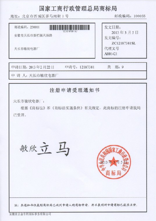 第9类“敏欣立马”受理通知书
