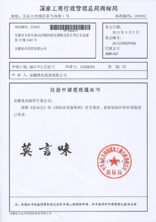 第33类“莫言味”受理通知书