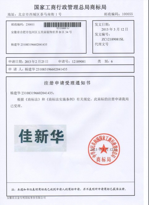 第6类“佳新华”受理通知书