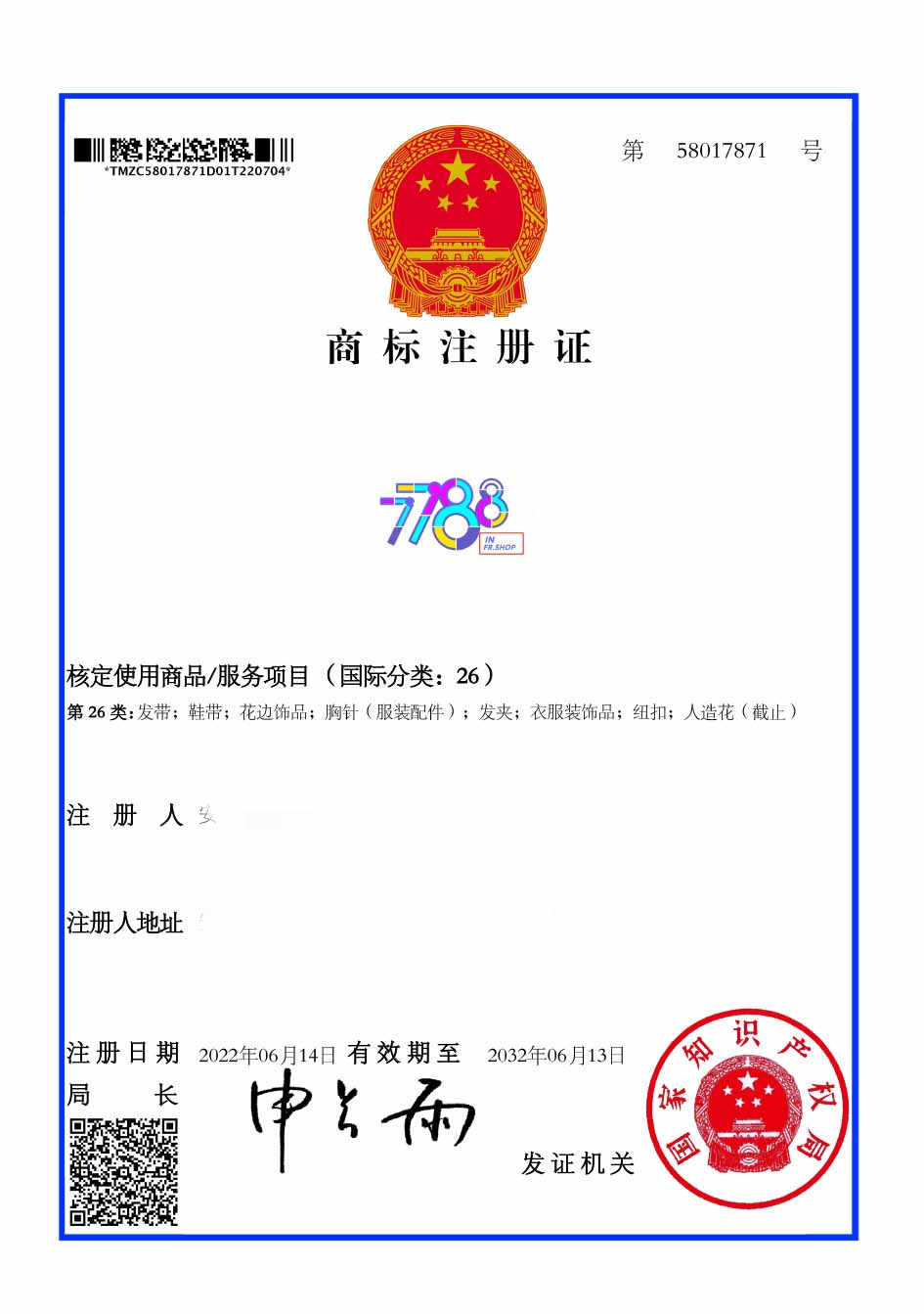 第26类“7788 IN FR SHOP”网彩365平台下载_365bet体育投注地址_足球365官网是哪个 证